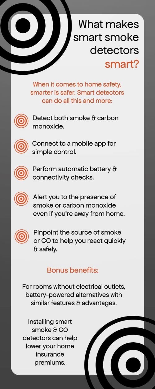 A smart smoke detector monitors smoke and carbon monoxide. Some of the best smart smoke detectors even do automatic battery checks to make sure the device is working properly.