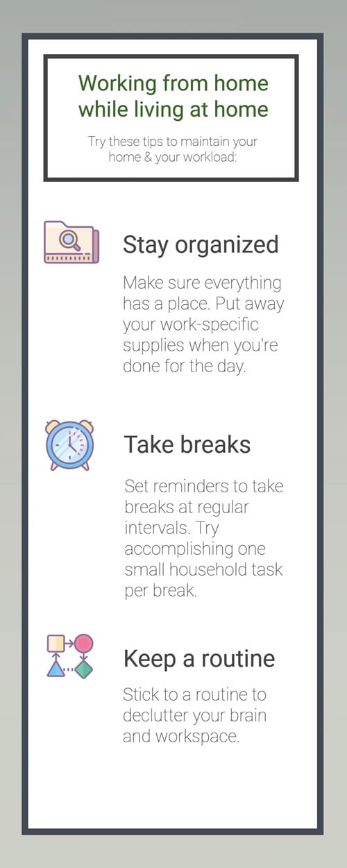 These are just a few work from home tips to keep your home free of clutter while you stay productive. Try incorporating other chores into your daily work routine and break schedule to find out what other home duties you can accomplish without scheduling extra time to do them.