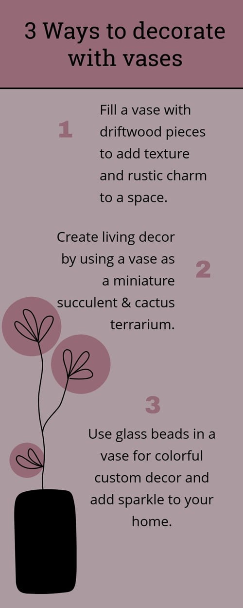 For example, restore a favorite vase by adding pieces of driftwood to create a custom, rustic piece. Opaque and colorful vases may be easily complemented by a tall, slender piece of wood, while a glass vase may better utilize smaller pieces, to create a small yet visible landscape.