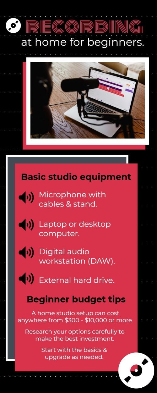 Depending on the type and amount of equipment you use, a home studio can cost $300 to more than $10,000. However, when comparing the cost to using professional recording studios, many experts argue that home studio recording is a sound investment - pun intended!